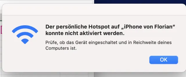 Apple ist bekannt für sein Öko-System. Airpods verbinden sich von selbst mit dem iPhone, Airdrop war und ist eine Dateitransfer-Revolution und das iPhone wird – sofern entsprechend eingerichtet – in den WLAN-Einstellungen eines MacBooks automatisch als Hotspot angezeigt. Dies hat beispielsweise bei mir jetzt seit anderthalb Jahren immer problemlos funktioniert, bis dann zu Beginn dieser Woche beim Versuch, MacBook und iPhone zu verbinden, diese Meldung erschien: