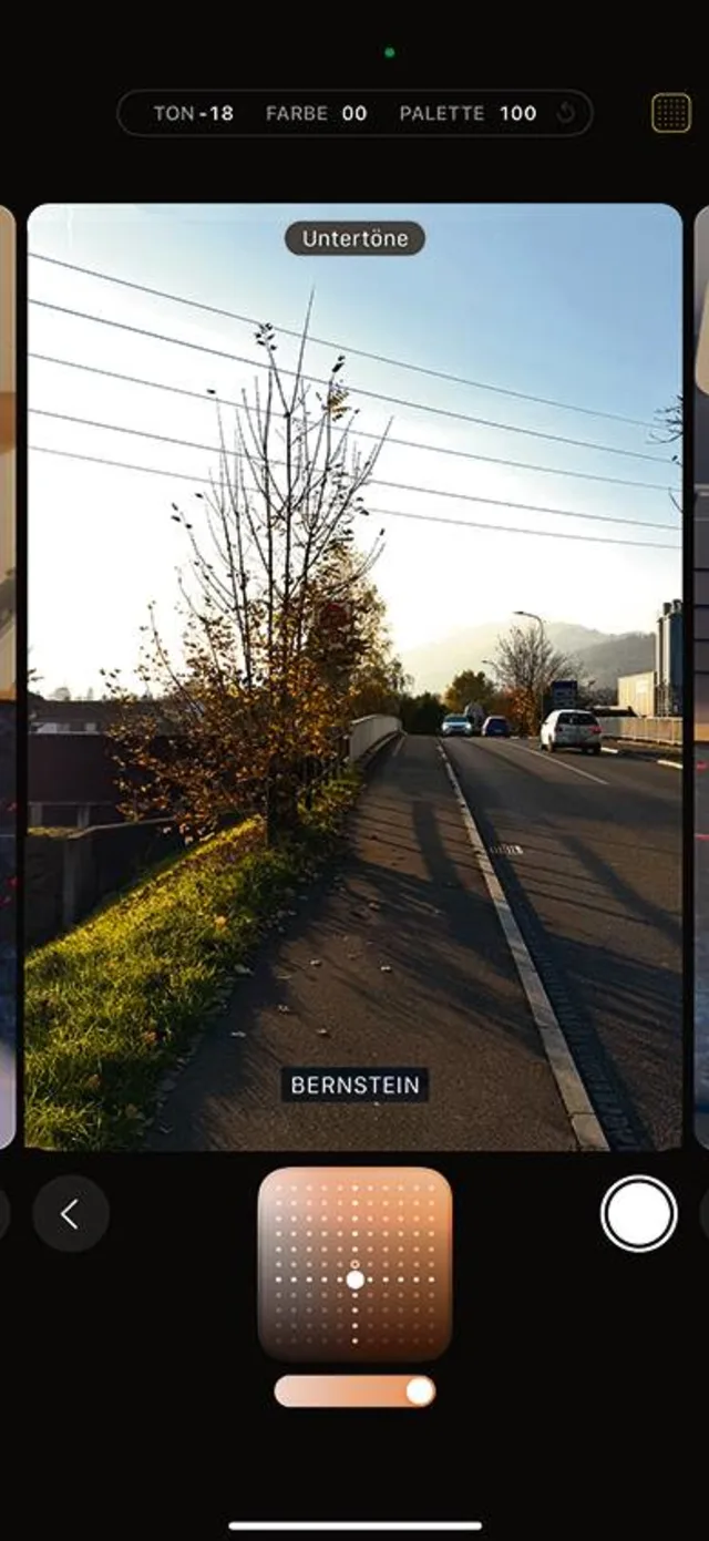 - Palette: Und dann ist da noch der Schieberegler für die Palette. Apple verwendet dazu den Ausdruck Untertöne. Sie wirken sich vor allem auf die Haut aus, während der Rest des Bildes deutlich weniger davon betroffen ist. Wenn das Gesicht durch einen Stil wie Bernstein eine attraktivere Tönung erhält, wirkt sich das nicht im selben Ausmass auf das weisse Hemd darunter aus. Der Schieberegler bietet die Möglichkeit, die Intensität der Änderung zu steuern.