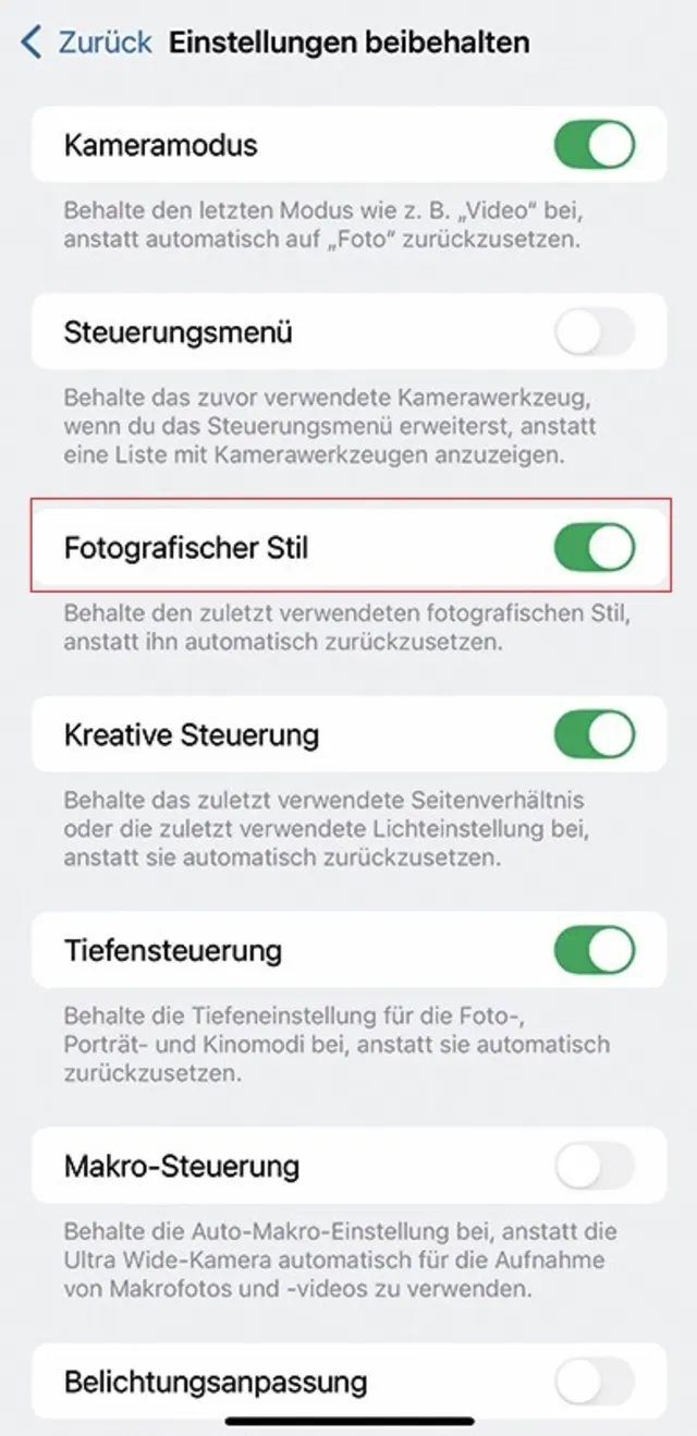 Quelle: PCtipp.chDas iPhone vergisst nach jedem Shooting, welche Werte Sie für die fotografischen Stile verwendet haben. Um das zu verhindern, öffnen Sie in den Einstellungen des iPhones den Bereich Kamera und danach die Kategorie Einstellungen beibehalten. Überzeugen Sie sich, dass der Schalter Fotografischer Stil aktiviert ist, Bild 4. Das birgt zwar ein Restrisiko, dass die nächsten Fotos etwas ungewohnt aussehen; aber da sich die Stile jederzeit ändern lassen, befinden Sie sich auf der sicheren Seite.
