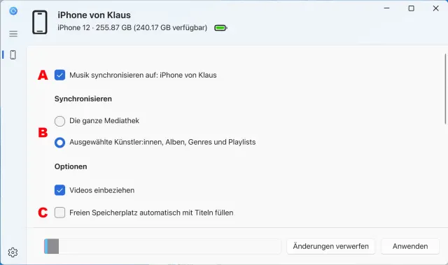 Bei der Sicherung wird immer das komplette Mobilgerät gespeichert – und das hilft bei der gezielten Verwaltung nur wenig. Dafür sind die einzelnen Kategorien zuständig, die mit einem Klick auf das iPhone-Symbol eingeblendet werden – oder dauerhaft, wenn Sie die drei Striche (Hamburger-Menü) darüber anklicken, Bild 2 A.Die Seitenleiste unterteilt sich in zwei Bereiche: Im oberen Bereich mit den Einstellungen B, legen Sie die Details zum Abgleich fest. Im unteren Teil finden Sie die einzelnen Kategorien Musik, Filme und TV-Sendungen ein zweites Mal; hier überprüfen Sie lediglich, welche dieser Medien auf dem Gerät installiert wurden C.