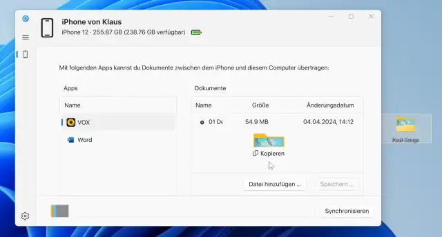 Und dann ist da noch der Bereich Dateien, der bestens geeignet ist, um Verwirrung zu stiften. Denn damit ist nicht etwa das Pendant zur App Dateien gemeint, die zum Lieferumfang des iPhones gehört. Stattdessen lassen sich hier Dokumente, Bilder oder Musikdateien direkt einer App zuordnen, die mit dem jeweiligen Dateityp umgehen kann und die für diese Art des Datenaustausches ausgelegt ist. In diesem Beispiel, Bild 7, wird ein Ordner mit Musik direkt vom Explorer in den Speicherbereich der App VOX gezogen – einem hübschen, etwas speziell gestalteten Musik-Player. Word-Dateien lassen sich der Word-App zuteilen und so weiter. Um so kopierte Dateien oder Ordner zu löschen, klicken Sie das Objekt an und drücken die Löschtaste. VOX erhalten Sie kostenlos im App-Store unter go.pctipp.ch/3337.