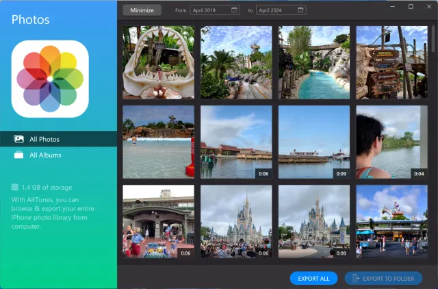 Bild 11: Die Fotos lassen sich nur über eine Schaltfläche exportieren; eine Funktion für den Import fehlt