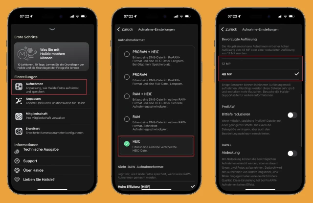 Aktuell bietet Apple in der Kamera-App keine Möglichkeit, ProRAW zu umgehen und direkt im Foto-Format HEIF mit 48 Mpx zu fotografieren. Das schafft hingegen die Vorzeige-App Halide Mark II – mit allen Optimierungen, die Apple auch den kleinen Bildern angedeihen lässt. Zwar gehen dabei die Vorzüge von ProRAW verloren; doch wenn die nicht relevant sind, schrumpfen die Bilddateien auf 14 MB – also etwa auf ein Viertel dessen, was eine ProRAW-Datei wiegt.Dazu öffnen Sie in der Halide-App die Einstellungen zu den Aufnahmen. Wählen Sie als Format HEIC. Blättern Sie ein wenig nach unten und wählen Sie als Auflösung 48 MP. Allerdings funktioniert das auch hier nur mit der Hauptkamera (1×), die als einzige mit einem 48-Mpx-Sensor bestückt ist.