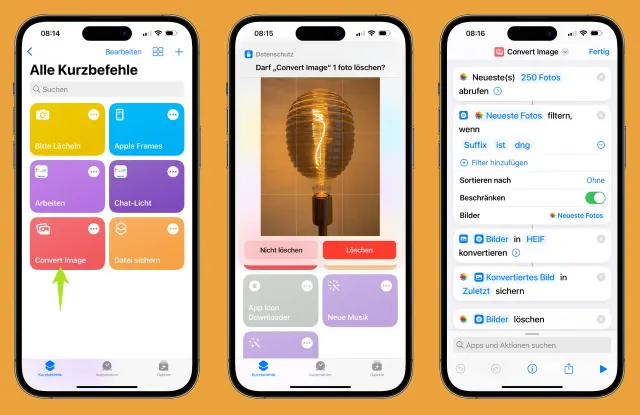 Doch sogar zu Halide gibt es eine kostenlose Alternative: ein offizieller Kurzbefehl, der die Fotosammlung nach RAW-Fotos aus allen möglichen Kameras durchsucht. Die Findlinge werden anschliessend ins HEIF-Format umwandelt – in voller Glorie und mit 48 Mpx. Rufen Sie dazu am iPhone, iPad oder Mac die Seite go.pctipp.ch/3034 auf und klicken Sie auf die Schaltfläche Kurzbefehl erhalten, um ihn mit einem weiteren Tippen auf Kurzbefehl hinzufügen zu installieren.Für die Aktivierung öffnen Sie die App Kurzbefehle und tippen auf den neuen Eintrag Convert Image. Jetzt werden die letzten 250 RAW-Dateien gesucht, in HEIF konvertiert und die Originale auf Wunsch in den Papierkorb verschoben. Der letzte Schritt ist zwar freiwillig – aber wenn Sie darauf verzichten, verbleiben diese Schwergewichte im vollen Gewicht in der Fotosammlung: