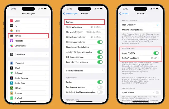 Bevor es 48 Mpx gibt, muss das RAW-Format in den Einstellungen aktiviert werden