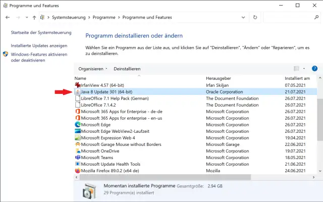 Klicken Sie auf Start, tippen Sie Systemst ein und öffnen Sie die Systemsteuerung. Gehen Sie darin via Programme/Programme und Features zu Programm deinstallieren. Hier finden Sie zum Beispiel Java 8 Update 301 (64-bit) von Oracle Corporation, Bild 1. Das Wichtigste: Java ist rückwärtskompatibel. Das heisst: Wer Java braucht, dem reicht die neuste/höchste Version, eine ältere ist unnötig. Falls Sie also mehr als einen Java-Eintrag pro Architektur haben (32 Bit, 64 Bit), deinstallieren Sie alle älteren Versionen.