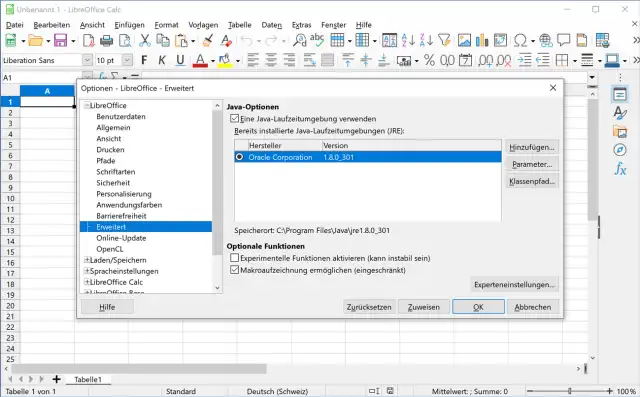 Quelle: PCtipp.chStarten Sie die Anwendung, die Java braucht, beispielsweise LibreOffice Calc. Entweder stellt diese automatisch fest, dass Java wieder da ist, oder Sie können ihr den Weg weisen. Etwa in LibreOffice Calc schauen Sie unter Extras/Optionen/LibreOffice/Erweitert nach, ob es Java bereits gefunden hat, Bild 2. Andere Anwendungen, die Java benötigen, bringen ähnliche Einstellungsmöglichkeiten mit. Falls Sie ihm den Weg zeigen müssen, installiert sich die derzeit aktuelle Version unter Windows im Ordner C:\Program Files\Java\jre1.8.0_301\ (oder C:\Programme\...). Die 32-Bit-Version dürfte unter C:\Program Files (x86)\Java\jre1.8.0_301\ (oder C:\Programme (x86)\...) zu liegen kommen.