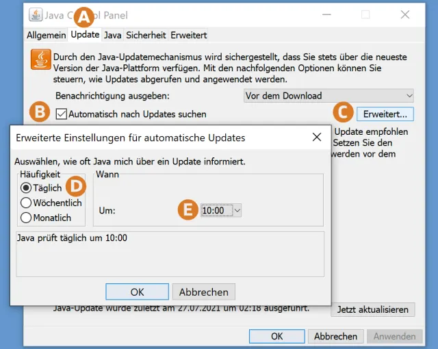 Quelle: PCtipp.chGehen Sie zum Reiter Update, Bild 4 A. Stellen Sie sicher, dass Automatisch nach Updates suchen aktiv ist B. Klicken Sie auf Erweitert C. Im kleinen Fenster wechseln Sie von Wöchentlich auf Täglich D und stellen eine Zeit ein E, in der Ihr Gerät normalerweise läuft. Klicken Sie auf OK.