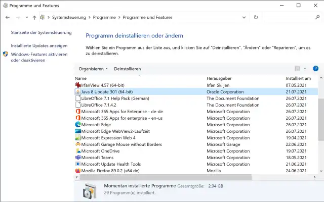 Deinstallieren: Klicken Sie auf Start, tippen Sie Systemst ein und öffnen Sie die Systemsteuerung. Gehen Sie darin via Programme und Features zu Programm deinstallieren. Hier finden Sie zum Beispiel Java 8 Update 301 (64-bit) von «Oracle Corporation». Das wichtigste nun: Java ist rückwärtskompatibel (anders als die Visual C++ Redistributables). Das heisst: Wer Java überhaupt benötigt, dem reicht die neuste/höchste Version. Falls Sie mehr als einen Java-Eintrag pro Architektur haben (32 Bit, 64 Bit), deinstallieren Sie alle älteren Versionen auf jeden Fall.