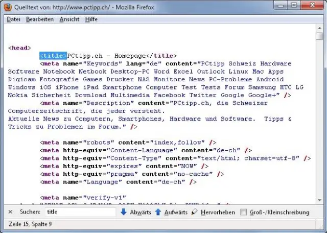 Quelle: PCtipp.chDiesen Seitentitel sehen Sie beispielsweise als Titel des Browsertabs. Sie finden den Titel auch im Quelltext der Webseite, z.B. nach einem Rechtsklick in die Seite und der Wahl von Seitenquelltext anzeigen. Suchen Sie dort nach dem HTML-Tag «title». Dahinter steht beispielsweise «PCtipp.ch - Homepage». Das ist der Seitentitel.