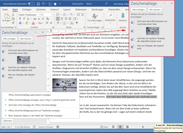 Klicken Sie im Reiter Start aufs kleine Symbol in der Ecke, Bild 1, rechts neben Zwischenablage. In der neuen linken Spalte gehts zu Optionen. Aktivieren Sie Sammeln ohne Anzeige der Office-Zwischenablage sowie Office-Zwischenablage anzeigen, wenn Strg+C zweimal gedrückt wurde. Ab jetzt merkt sich Word alle Textschnipsel und sonstigen Elemente (Bilder, Formen etc.), die Sie systemweit kopieren, bis zu den letzten 24 Stück. Die linke Spalte können Sie übers X wieder schliessen. Drücken Sie zweimal Ctrl+C, während etwas markiert ist, erscheint die Spalte wieder. Damit können Sie auch zuvor kopierte Elemente schnell wieder einfügen, ohne sie nochmals mühselig suchen und kopieren zu müssen. Word bzw. hier eher Windows quittiert jeden Kopiervorgang mit einem kleinen gelben Pop-up unten rechts. Falls dies Sie stört, klappen Sie unten rechts in der Taskleiste über das kleine Winkel-Symbol den Infobereich auf, klicken mit rechts aufs Klemmbrett-Symbol und deaktivieren im Untermenü Optionen den Punkt Beim Kopieren Status in der Nähe der Taskleiste anzeigen.