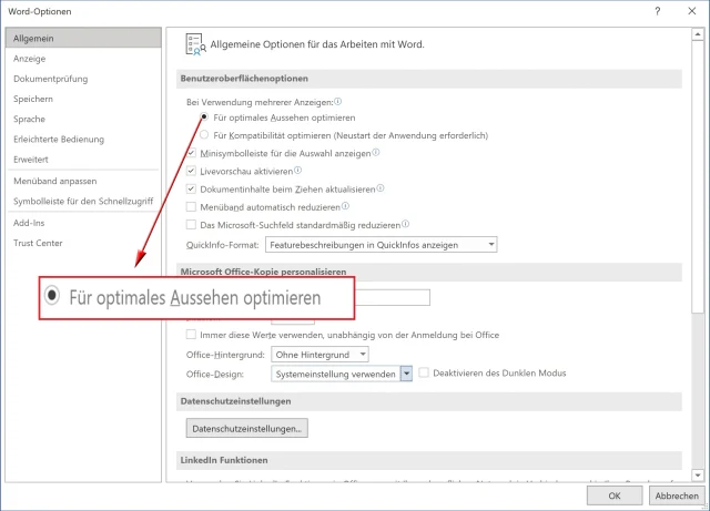 Eine zunehmende Zahl Nutzerinnen und Nutzer bevorzugt in Apps und Programmen den Dunkelmodus. Manche schalten auch gerne zwischen verschiedenen Modi um. Damit Sie Office nicht separat hin- und herschalten müssen, bringen Sie es dazu, sich automatisch an jenen Modus anzupassen, den Sie in Windows gewählt haben. Öffnen Sie das Menü Datei/Optionen und gehen Sie bei Allgemein zum Bereich Microsoft Office-Kopie personalisieren. Schnappen Sie im Ausklappmenü bei Office-Design den Punkt Systemeinstellung verwenden, Bild 2.