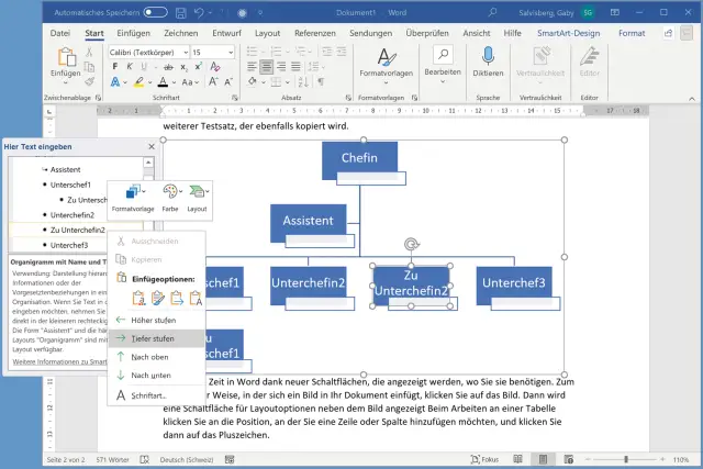 Unter Einfügen/SmartArt finden Sie unter dem Punkt Hierarchie neben anderen Grafiktypen auch einfache Organigrammvorlagen. Tippen Sie die Namen bzw. Rollen nicht direkt in die Boxen, sondern verwenden Sie den Textkasten. Anfangs möchte man noch rätseln, wie man die dritte Ebene befüllt, dabei ist es ganz simpel, Bild 3: Soll «Unterchefin2» einen Untergebenen erhalten, tippen Sie diesen (hier: «Zu Unterchefin2») zunächst in der Liste unterhalb von «Unterchefin2» ein. Klicken Sie anschliessend mit rechts auf den Eintrag und wählen Sie Tiefer stufen. Schon wird «Zu Unterchefin2» an die zugehörige «Unterchefin2» angehängt. Nach wenigen