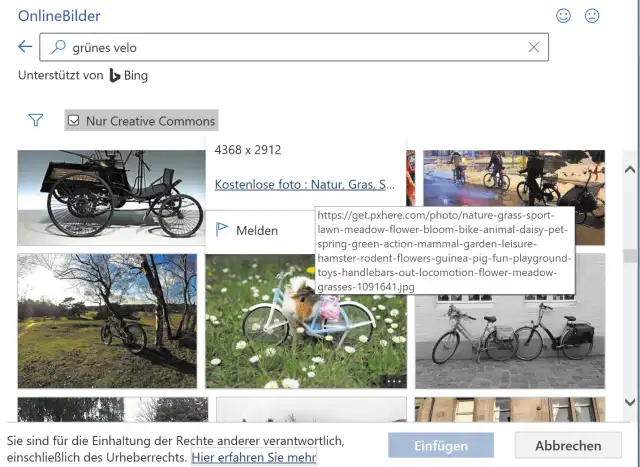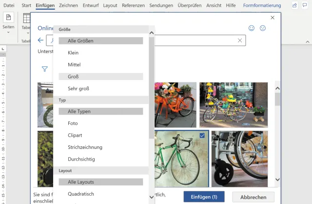 Braucht Ihr Text ein paar Illustrationen, damit keine Bleiwüste draus wird? Gehen Sie zum Menüpunkt Einfügen/Bilder/Onlinebilder. Hier greift Word zur Bildersuche von Microsofts Suchmaschine Bing.com. Bei der Suche nach «grünes Velo» werden tatsächlich ein paar grüne Zweiräder entdeckt, obwohl der Suchbegriff «Fahrrad» möglicherweise mehr Resultate als das schweizerische «Velo» ausgegraben hätte, Bild 4.