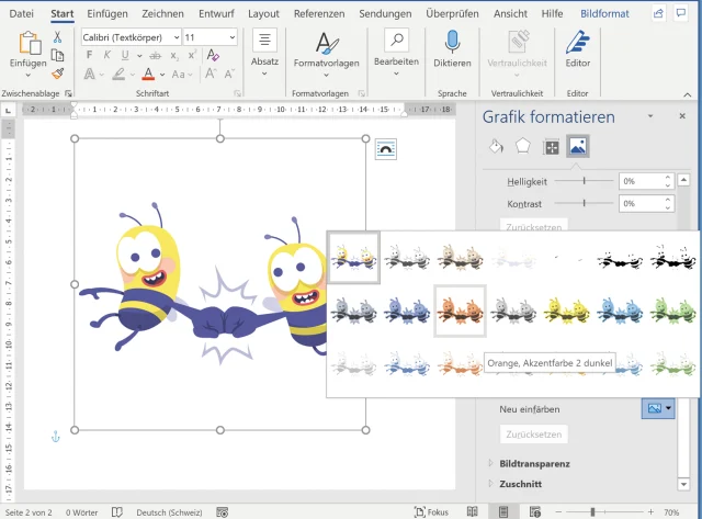 Fügen Sie beispielsweise einen der Comic-Bienen-Sticker ein. Klicken Sie mit rechts darauf und gehen Sie zu Grafik formatieren. Wechseln Sie in der rechten Spalte oben zu Bildkorrekturen, Bild 8. Unter Neu einfärben verpassen Sie dem eingefügten Bild eine andere Farbe. Das Resultat ist nicht bei allen Stickern gleich gut, aber bei vielen Vorlagen ergeben sich äusserst interessante Gestaltungsmöglichkeiten.