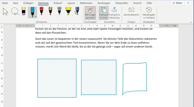 Wählen Sie im Reiter Zeichnen einen Stift und dessen Farbe aus. Aktivieren Sie einmal den Eintrag Freihand in Form. Malen Sie per Maus (auf Touchscreens per Finger oder Stift) ein Viereck hin, ersetzt Word dieses beim Absetzen des Fingers oder Loslassen der Maustaste durch eine exakte Viereckform, Bild 13. Seien Sie nicht enttäuscht: Per Maus vermögen die Resultate meistens nicht besonders zu überzeugen, auch wenn es durchaus Spass macht, mit der Funktion ein wenig herumzuspielen.