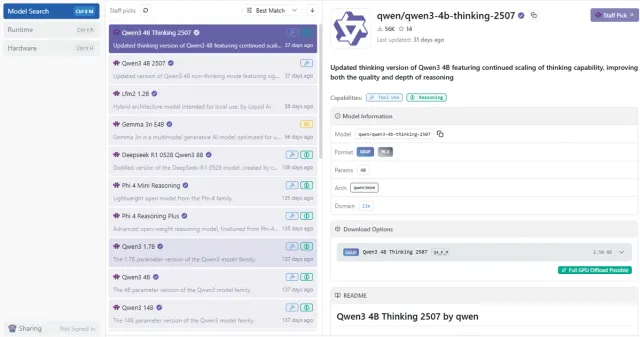 Um weitere Modelle zu installieren, klicken Sie auf den Button mit dem Lupen-Symbol. In der Liste der empfohlenen Modelle befindet sich auch DeepSeek-R1-0528-Qwen3-8B.