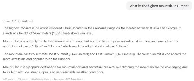 Quelle: PCtipp.chMit dem Befehl Load Model laden Sie das heruntergeladene Modell ins Studio. Über das Chat-Feld kommunizieren Sie mit Llama, das trotz der eher geringen Grösse meist gute Antworten liefert. Versuchen Sie es etwa mit der Frage «What is the highest mountain in Europe?», Bild 4.
