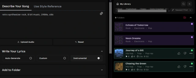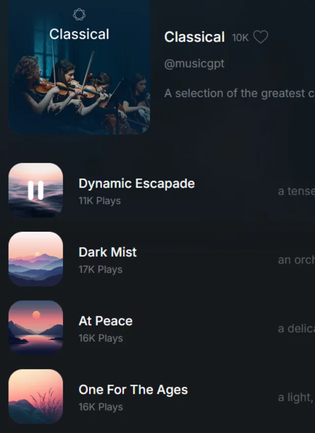 MusicGPT ist ein KI-Musikgenerator, der Prompts innerhalb weniger Minuten in komplette, originelle Songs verwandelt. Egal, ob Sie als Musiker nach Inspiration suchen, Hintergrundmusik benötigen oder einfach nur neugierig auf die kreativen Möglichkeiten von KI sind. Auf der webbasierten Bedienoberfläche können Sie Ihren gewünschten Sound beschreiben und sofort zwei KI-produzierte Songs generieren lassen. Sie können dabei Instrumente, Genre, Stimmung und Struktur vorgeben und ausserdem eine grosse Bibliothek mit KI-Tracks der Community erkunden, Bild 1.