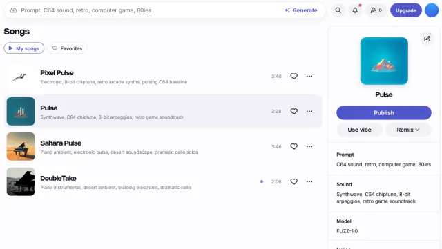 Quelle: PCtipp.chDazu ein Beispiel: slow piano, building up, desert vibes, dramatic, electronic, cello solo. Auch hier haben Sie mit einem Schieberegler die Option, rein instrumentale Musik zu erzeugen. Ein Klick auf Generate generiert zwei Versionen des Musikstücks – die meist zwischen zwei und vier Minuten lang sind. Freunde der Musik des Commodore 64 können Sounds produzieren, etwa mit dem Prompt C64 sound, retro, computer game, 80ies. Über das Symbol mit den drei Punkten lassen sich die Werke herunterladen. Ein Klick auf Remix erzeugt weitere Versionen.
