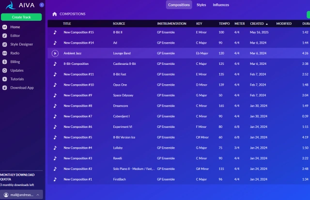 Bild 5: Mit Aiva lassen sich beliebig viele Musikstücke erstellen, aber in der Gratisversion nur drei pro Monat herunterladen