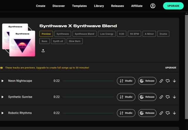 Bild 9: Pro Prompt erhalten Sie mit Loudly drei Versionen eines Musikstücks, die jedoch auf 30 Sekunden limitiert sind