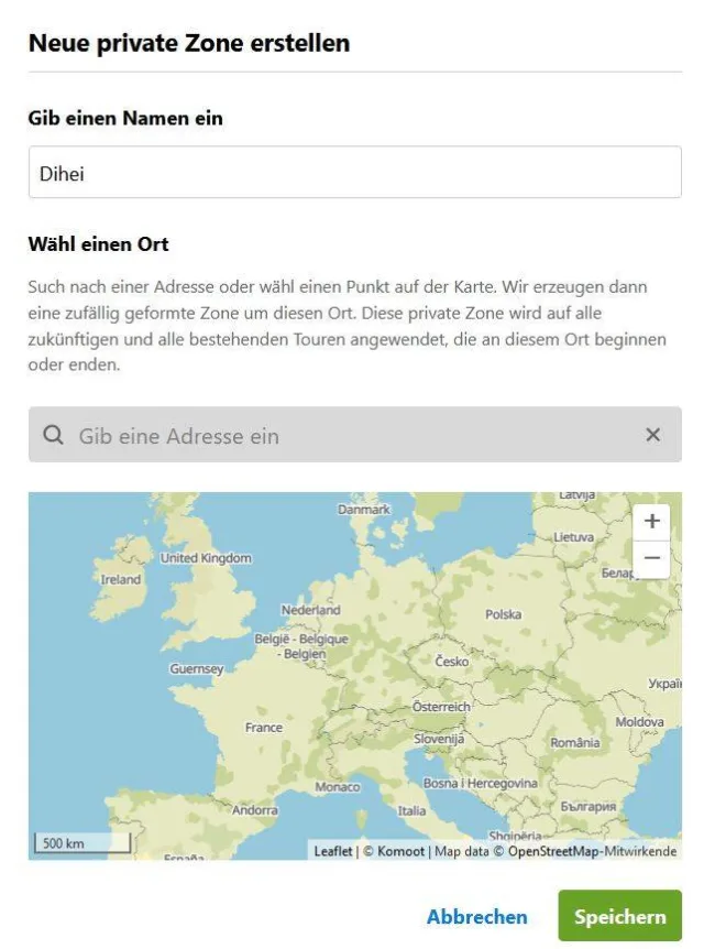 - Geben Sie der Zone einen Namen und suchen Sie nach der gewünschten Adresse. Komoot erzeugt dann eine zufällige Zone rund um diese Adresse. Diese private Zone wird auf künftige und alle bestehenden Touren angewendet, die an diesem Ort beginnen oder dort enden.