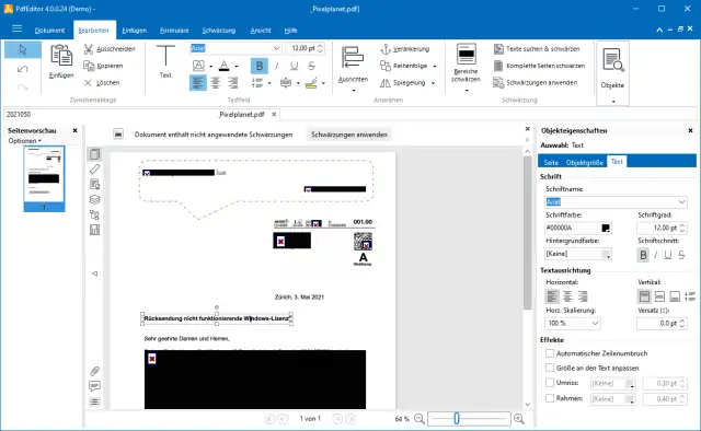 Vorhang auf für den PixelPlanet PdfEditor . Die Software aus Deutschland punktet mit einer an Word erinnernden, sehr übersichtlichen und sofort verständlichen Bedienoberfläche. Neben klassischen Bearbeitungsfunktionen kann es PDFs auch schwärzen – und zwar so, dass sich die dahinter liegenden Texte nicht mehr wiederherstellen lassen. In der Demoversion stehen alle Funktionen zur Verfügung. Allerdings wird beim Speichern ein Demo-Hinweis in Form eines gut sichtbaren Wasserzeichens in der Datei landen. Soll der weg, erwerben Sie die Software für 79 Euro, umgerechnet etwa 87 Franken. Diese Einzelplatzlizenz ist unbegrenzt gültig. Kostenlose Updates gibt es allerdings nur innerhalb der Hauptversion, derzeit Version 4.0.0.24.