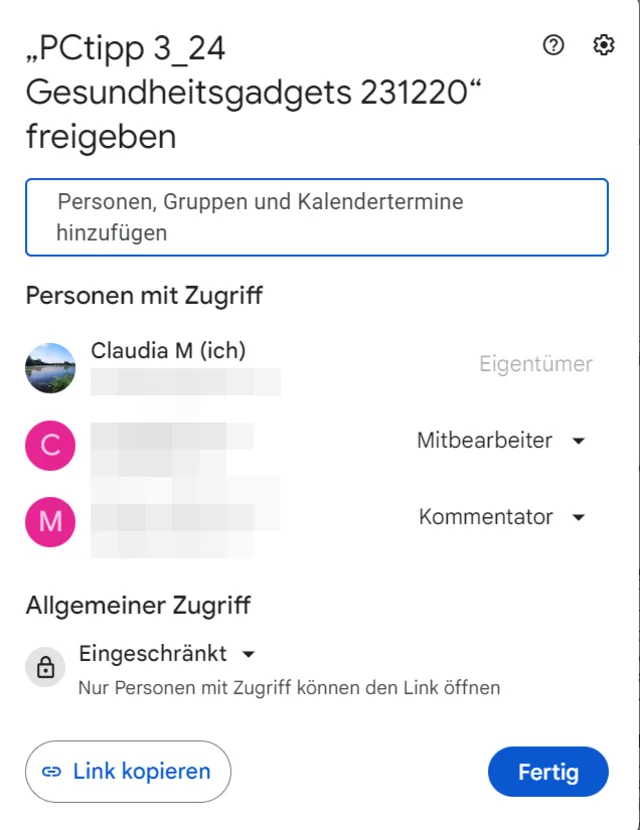 Quelle: PCtipp.chÖffnen Sie das Dokument in Google Docs, das Sie mit anderen bearbeiten möchten. Es ist übrigens nützlich, wenn sämtliche Freunde oder Mitarbeitenden ebenfalls ein Konto bei Google haben, doch zwingend erforderlich ist es nicht. Über das Menü Datei gelangt man zur Option Freigeben sowie Für andere freigeben. Anschliessend können die E-Mail-Adressen der Personen oder Gruppen ausgewählt werden, mit denen man das Dokument gemeinsam bearbeiten möchte, Bild 10. Der Zugriff kann beschränkt werden. Zur Auswahl stehen Eingeschränkt oder Für jeden freigegeben, der einen Link erhält. Den Link kann man auch direkt kopieren. Die hinzugefügten Personen können als Betrachter, als Kommentator oder Mitarbeiter hinterlegt werden. Der Zugriff auf ein Dokument kann jederzeit wieder entfernt werden.