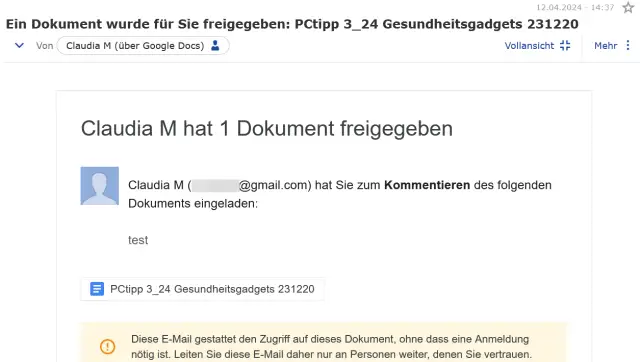 Die andere Person greift über den Link auf das Docs-Dokument zu, Bild 11. Kommentiert wird über das Kommentar-Icon oben rechts. Um kommentieren zu können, werden wir aufgefordert, uns mit einem Google-Konto anzumelden. Ein Klick auf das Kommentar-Icon zeigt alle Kommentare, Bild 12.