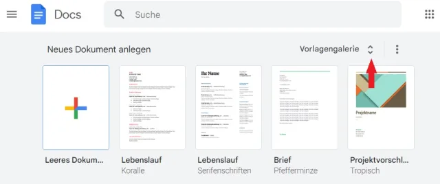 Um die Vorlagen auszublenden, klickt man oben rechts neben Vorlagengalerie auf die drei übereinanderliegenden Punkte und wählt Alle Vorlagen ausblenden. Allerdings verschwindet dann auch der Leeres-Dokument-Schnellzugriff. Als Alternative kann ganz unten auf den farbigen Plus-Button geklickt werden, um ein neues, leeres Dokument anzulegen.