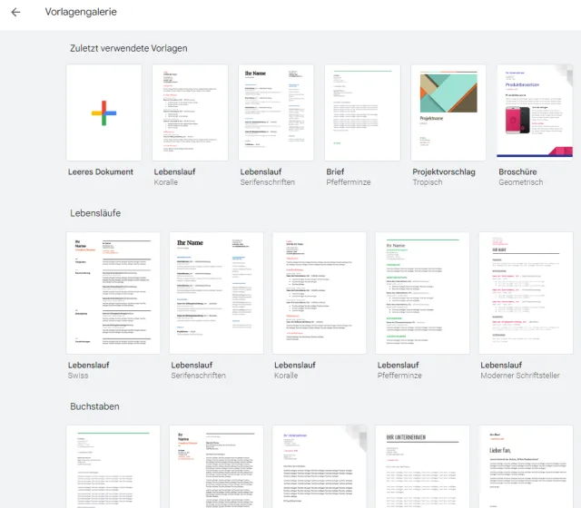 Nehmen wir an, wir möchten einen neuen Lebenslauf erstellen. Google Docs bietet hierzu einige Vorlagen an. Die Vorlagengalerie ist direkt neben Neues Dokument anlegen platziert. Für den Schnellzugriff wird in unserem Beispiel ein Lebenslauf in «Koralle» oder mit «Serifenschriften» angezeigt. Um mehr Vorlagen zu sehen, klickt man auf das Symbol mit dem Auf- und Abpfeil, Bild 4. Derzeit sind fünf Lebenslaufvorlagen zu finden, aber auch diverse weitere Dokumentenvorlagen wie Briefe, Projektvorschläge, Broschüren, Besprechungsnotizen und mehr. Über das Pfeilsymbol oben links gelangt man wieder zur Übersicht zurück, Bild 5.