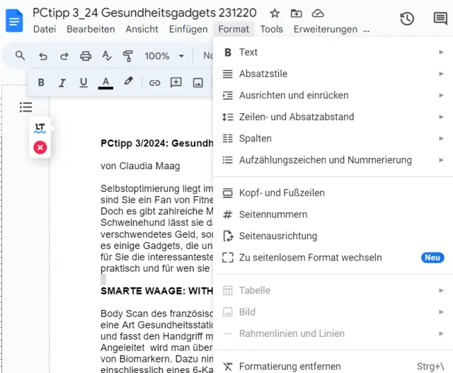 Die verfügbaren Formatfunktionen sind fast alle über den Menüpunkt Format zu finden, einige verstecken sich aber auch in der Schnellfunktionsleiste. Dort sind weitere hinter dem Drei-Punkte-Symbol verborgen, zum Beispiel auch die Befehle Bild einfügen oder Kommentar hinzufügen. Sehr praktisch: In Google Docs gibt es ausserdem eine Rechtschreib- und Grammatikprüfung.