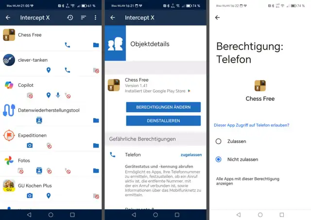 Ein kurzer Blick bei unserem Beispiel zeigt, dass das Schachprogramm und die App für Tankpreise einen Zugriff auf das Telefon haben, Bild 11. Oder die Box-App hat Zugriff auf das Mikrofon. Warum?