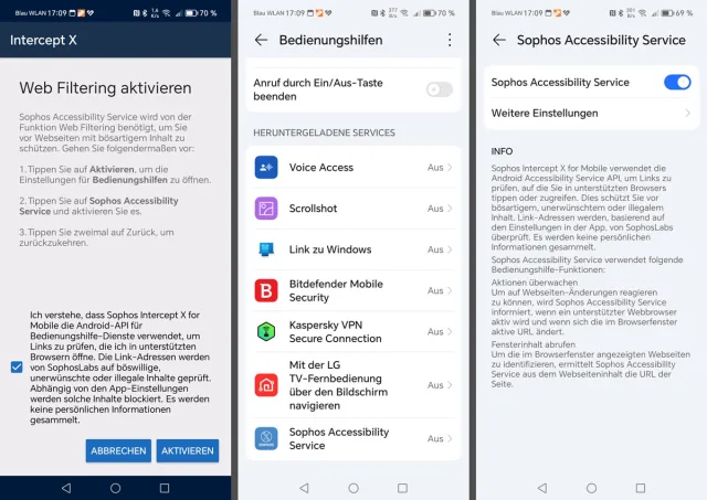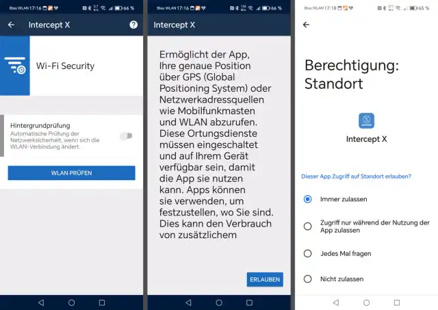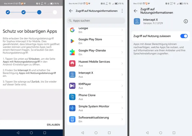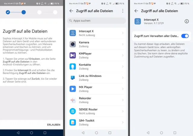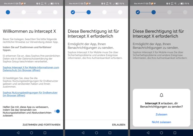 Stimmen Sie Nutzungsbedingungen zu und drücken Sie auf Zustimmen und Fortfahren, Bild 1. Danach müssen Sie die Benachrichtigungen Erlauben – ebenso den Zugriff auf alle Dateien, Bild 2. Dazu führt Sie das Tool in ein Untermenü Ihrer Smartphone-Einstellungen. Dort wählen Sie den Eintrag Intercept X und lassen per Schieberegler den Zugriff zu.
