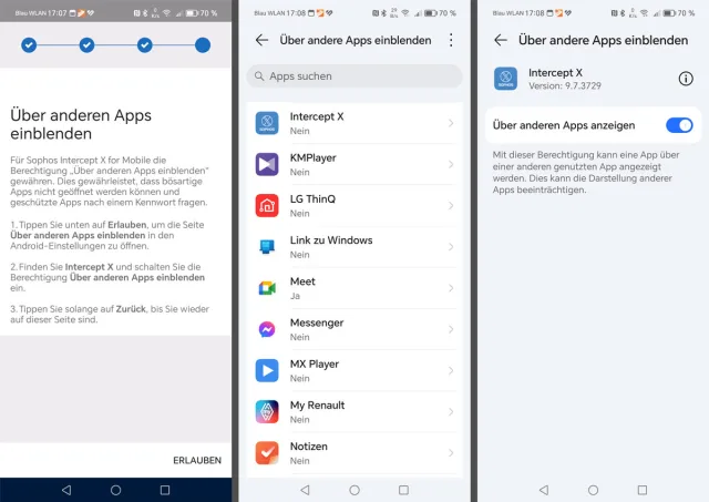 Bild 4: Über andere Apps einblenden bedeutet mehr Schutz gegen verseuchte Apps und sichert gesperrte Apps ab