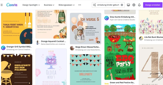 Quelle: PCtipp.chDie Auswahl an Vorlagen wirkt fast schon erdrückend, sodass es in einem ersten Anlauf hilft, dem Dienst fünf oder mehr Stichwörter vorzugeben D. Mit einer Vorgabe wie Einladung Kinder Geburtstag Wald Spiele Grill hagelt es Vorschläge. Die passendsten Ideen werden zwar nicht immer an erster Stelle gezeigt, doch mit ein wenig Blättern wird es immer besser, Bild 2.