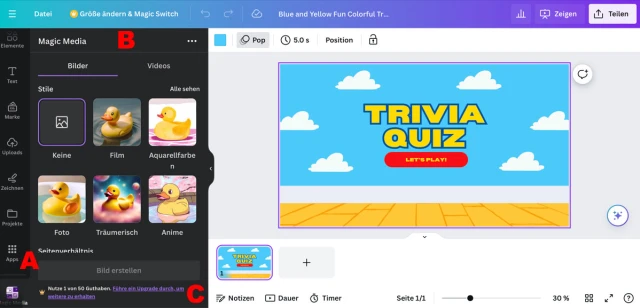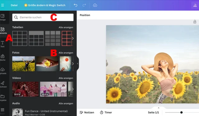 Eine durchdachte Vorlage bildet erst den Anfang einer Kreation. Canva bietet unzählige Möglichkeiten, weitere Objekte hinzuzufügen: entweder aus der Clip-Art-Dose, KI-generierte Inhalte oder eigene Medien, die vom Computer in die Canva-Umgebung geladen werden.Stock-Fotos