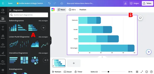 Die Diagramme in Canva wirken schlicht, aber deswegen nicht weniger ästhetisch. Klicken Sie auf einen Diagrammtyp, Bild 6 A, damit die Vorlage automatisch platziert und die Datengrundlage eingeblendet wird. Sie könnten die Tabelle anschliessend manuell füllen, aber auch ein Google Sheet oder eine CSV-Datei importieren. Bei Diagrammtypen wie der Fortschrittsanzeige wird hingegen lediglich die Position des Zeigers an die gewünschte Stelle gebracht.