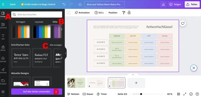 Nachdem die Präsentation mit 50 Seiten steht, kommen vielleicht Zweifel am Design auf. Doch Canva macht es sehr einfach, die bestehende Farb-/Schrift-Kombination über den Haufen zu werfen und eine neue Fassung anzuwenden. Klicken Sie dazu auf den Bereich Design, Bild 7 A, und danach auf Stile B. Hier sehen Sie die aktuelle Farbgebung und die Schriften. Um zum Beispiel nur die Fonts auszutauschen, klicken Sie neben Schriftarten-Sets auf Alle anzeigen C. Wählen Sie eine neue Kombination aus und schliessen Sie die Änderung über die Schaltfläche Auf alle Seiten anwenden ab D.