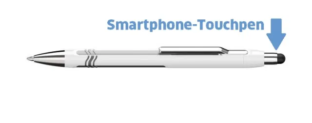 Quelle: Microspot/PCtipp.chEinige Produkte verfügen über eine Doppelfunktion: Es handelt sich um ansonsten gewöhnliche Kugelschreiber mit dem üblichen Clip. Am anderen Ende des Stifts befindet sich der Kugelschreiberknopf, der so gestaltet wurde, dass er auf einem Smartphone wie ein sehr schlanker Finger funktioniert. (PCtipp-Forum)