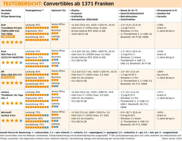 Convertibles sind die Formwandler in der Welt der Laptops. Dank ihrer Wandlungsfähigkeit sind sie Tablet, Präsentationswerkzeug und natürlich auch klassisches Notebook. Pluspunkte scheffeln die rassigen 2-in-1-Laptops nicht nur punkto Bedienung, Design und Verarbeitung. Dank ihrer hochwertigen Komponenten sind Sie auch bei der Akkulaufzeit bis hin zum Tempo eine Klasse für sich. Zwei Kostproben, die das eindrucksvoll bestätigen, sind unser Preistipp Acer TravelMate P4 Spin sowie HPs Elite x360 830 G10. Ersteres ist mit einem Nvidia-RTX-2050-Grafikchip ausgestattet, womit sich auch gut spielen lässt. Bei HPs Elite x360 ist der Name Programm: Das Convertible ist nicht nur hübsch anzusehen, unser Testsieger kann auch mit herausragenden Businessfunktionen punkten.