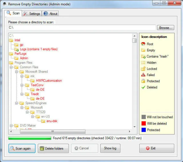 Quelle: PCtipp.chDrücken Sie nun auf Scan folders. Nun sucht das Programm nach allen darunterliegenden Verzeichnissen. Der Legende rechts entnehmen Sie, welche Ordner unberührt bleiben (grau) und welche Ihnen zum Löschen vorgeschlagen werden (rot). Sie können nun standardmässig alle rot markierten Ordner mit einem Klick auf Delete Folders ins Jenseits befördern.