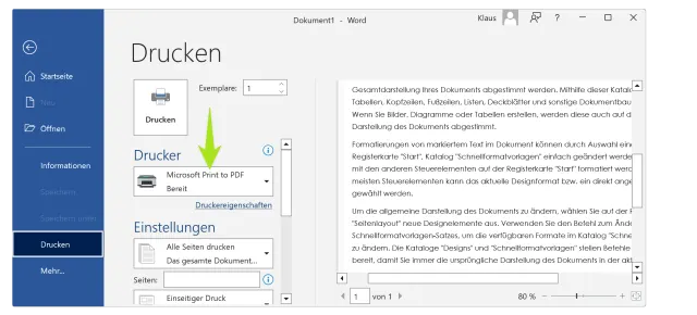 Neben Photoshop-Dateien nehmen auch PDFs eine besondere Stellung unter den Formaten ein. Meistens werden sie direkt im Drucken-Dialog einer Anwendung erstellt, etwa in Word unter Windows: