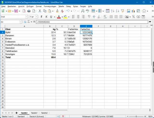 Diese Farbcodes fügen wir bei den jeweiligen Datenzeilen in einer Hilfsspalte hinzu, die wir FarbeHex nennen. Fürs automatische Zuweisen braucht LibreOffice die Farben jedoch im Dezimalformat. Das ist aber kein Problem, denn in einer weiteren Hilfsspalte (namens FarbeDez) rechnen wir dies einfach mit einer Formel um, zum Beispiel: =HEXINDEZ(D2). Jetzt haben wir die benötigten Farbcodes beisammen.