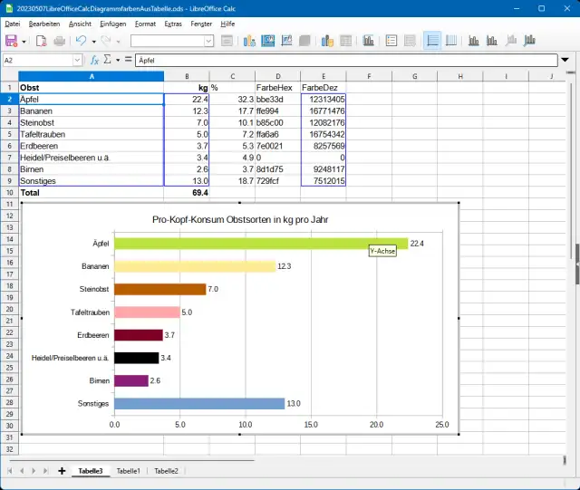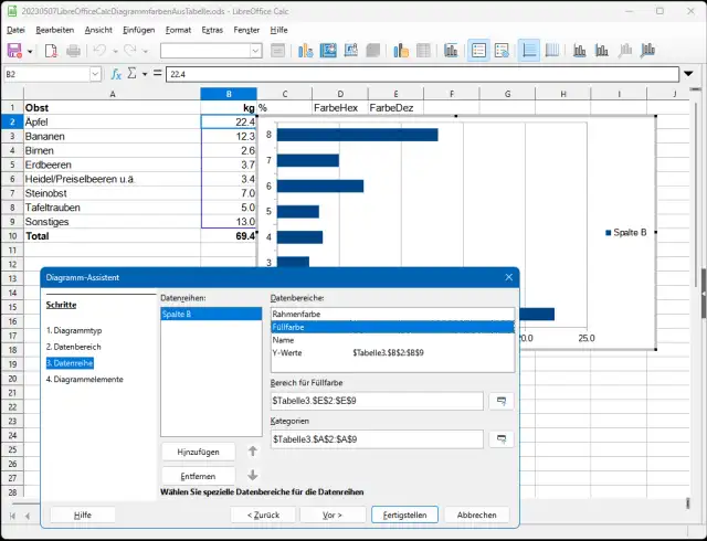 Wir markieren die Daten, aus denen wir gerne ein neues Diagramm erstellen wollen. Diesmal vielleicht nicht die Prozent-Spalte, sondern die Angaben an verzehrten Kilogramm an Obst pro Jahr und Person. Unter Einfügen/Diagramm wähle ich diesmal spasseshalber kein Torten- sondern ein Balkendiagramm. Nach zwei Klicks auf den Button Vor landen wir bei Datenreihe. Hier folgt ein Klick auf Füllfarbe, anschliessend hinter dem Feld «Bereich für Füllfarbe» aufs Auswahlsymbol. Hier können Sie die Zellen auswählen, in der Ihre Dezimalfarbcodes stehen. Oder (weil bei uns gerade das Diagramm im Weg ist) auch den Bereich von Hand angeben, zum Beispiel so: $Tabelle3.$E$2:$E$9. Da wir schon hier sind, tun wir dies auch für die Kategoriennamen, die wir vor den farbigen Balken haben wollen: $Tabelle3.$A$2:$A$9.