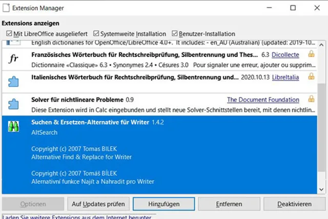 Mit dem Extension Manager können Sie Erweiterungen für das Open-Source-Office-Paket installieren, aktualisieren bzw. deinstallieren.
