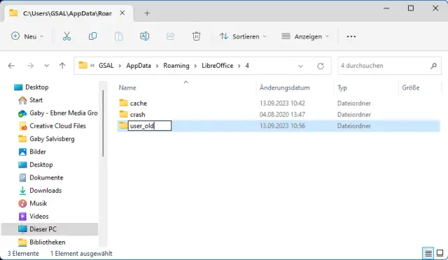 Die Lösung besteht darin, den Ordner mit den erwähnten Einstellungsdaten zu leeren oder umzubenennen. Beenden Sie zunächst alle zu LibreOffice gehörenden Programme. Öffnen Sie ein Explorer-Fenster. Tippen Sie in der Adresszeile die Zeichenfolge %appdata% ein und drücken Sie Enter. Der Explorer zeigt Ihnen den Inhalt eines Ordners wie C:\Users\IhrName\AppData\Roaming. Öffnen Sie den Unterordner \LibreOffice\4\, entdecken Sie einen Ordner namens user. Benennen Sie ihn um, beispielsweise in user_old.