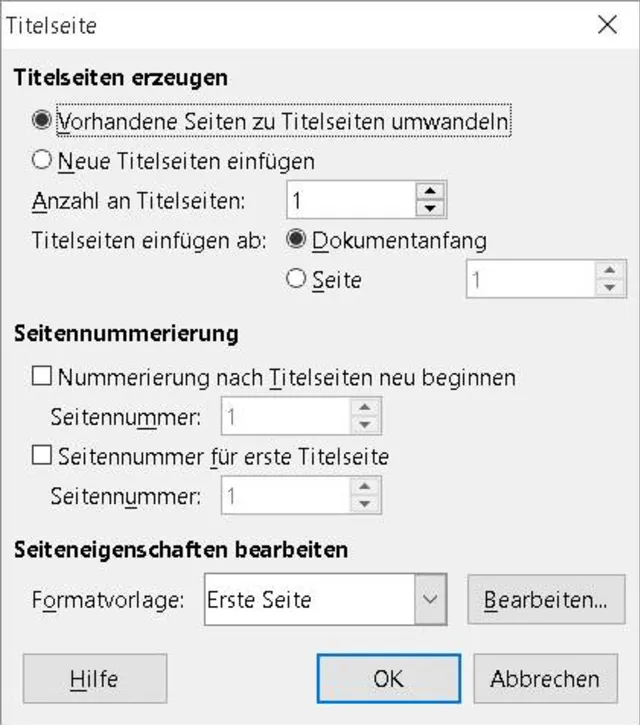 Quelle: PCtipp.chEs gibt aber auch einen anderen Lösungsweg, der zum gleichen Ziel führt. Das eignet sich dafür, wenn Sie die Titelseiten (eine oder mehrere) nicht für die Nummerierung berücksichtigen wollen. Öffnen Sie Format/Titelseite. Falls Sie schon selbst eine Titelseite gestaltet haben, aktivieren Sie «Vorhandene Seiten zu Titelseiten umwandeln». Wählen Sie darunter die Anzahl der betroffenen Seiten. Im unteren Teil des Dialogs aktivieren Sie bei «Seitennummerierung» die Option «Nummerierung nach Titelseiten neu beginnen». Soll sie auf der zweiten Seite anfangen, tippen Sie bei Seitennummer eine 2 ein.