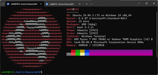 Nachdem Sie jetzt die Grundlagen kennengelernt haben, ist es an der Zeit, sich ein wenig intensiver mit WSL zu beschäftigen. Öffnen Sie ein Fenster des Terminals oder der PowerShell und geben Sie wsl ein, um etwa die Ubuntu-Shell zu starten. Hier können Sie nun verschiedene Linux-Befehle eintippen und ausführen. So zeigt etwa das bereits kurz erwähnte Kommando ls den Inhalt des aktuellen Verzeichnisses. Mit sudo apt update und sudo apt upgrade sowie Ihrem Passwort aktualisieren Sie das virtuelle Ubuntu. Das sollten Sie aus Sicherheits- und Stabilitätsgründen immer wieder mal durchführen.Geben Sie danach zum Beispiel den Befehl sudo apt install neofetch ein, um das Linux-Tool Neofetch zu installieren. Bestätigen Sie die Rückfrage mit der Taste Y und warten Sie kurz, bis das Tool installiert wurde. Geben Sie danach den Befehl neofetch ein, um es zu starten. Das Tool informiert mitsamt einer hübschen Grafik über das installierte Betriebssystem, die Kernel-Version und einiges mehr, Bild 11.